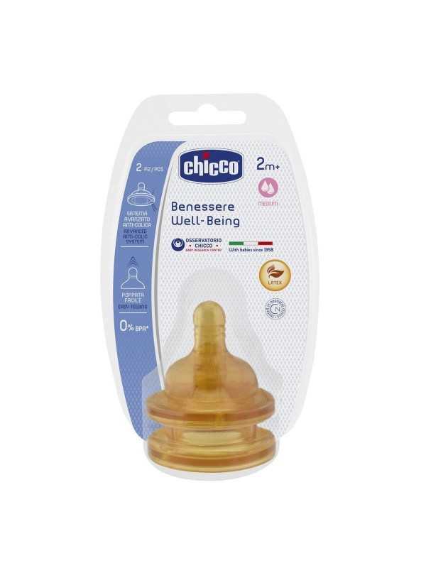 Chicco Tetina Latex Flujo Medio es una tetina que tiene la finalidad de mantener el cuello del recién nacido en la posición correcta, ya que su diseño incorpora anillos en relieve en su base que imitan el seno materno.