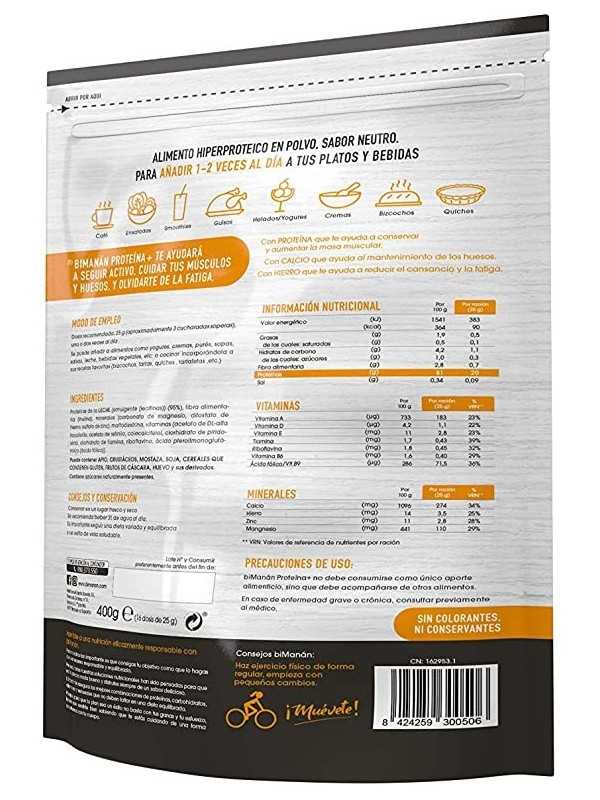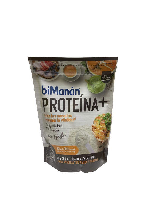Bimanan Proteina + es un concentrado de proteínas procedentes de la leche que actúa proporcionando un aporte extra de proteínas. Trasforma cualquier comida en hiperproteica, sin variar el sabor de la comida (posee sabor neutro), aportando una mayor sensación de saciedad. Además las proteínas de Bimanan proteína + son de fácil digestión y muy solubles, por lo que son ideales para añadir a tus comidas.