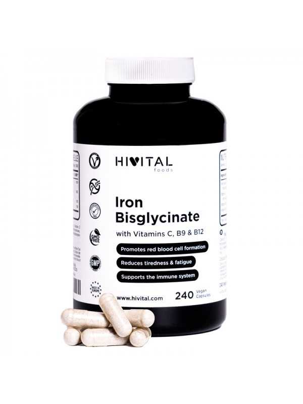 EXCELENTE FÓRMULA a base de Hierro puro vegetal (NO HEMO) en su forma molecular aminoquelada Bisglicinato de máxima absorción, Vitamina B12 en su forma Metilcobalamina, Ácido Fólico en su forma Metilfolato y Vitamina C como L-Ascorbato Cálcico. El Hierro te ayudará a tratar la anemia, a mejorar la memoria y a fortalecer las uñas y el sistema inmunológico.