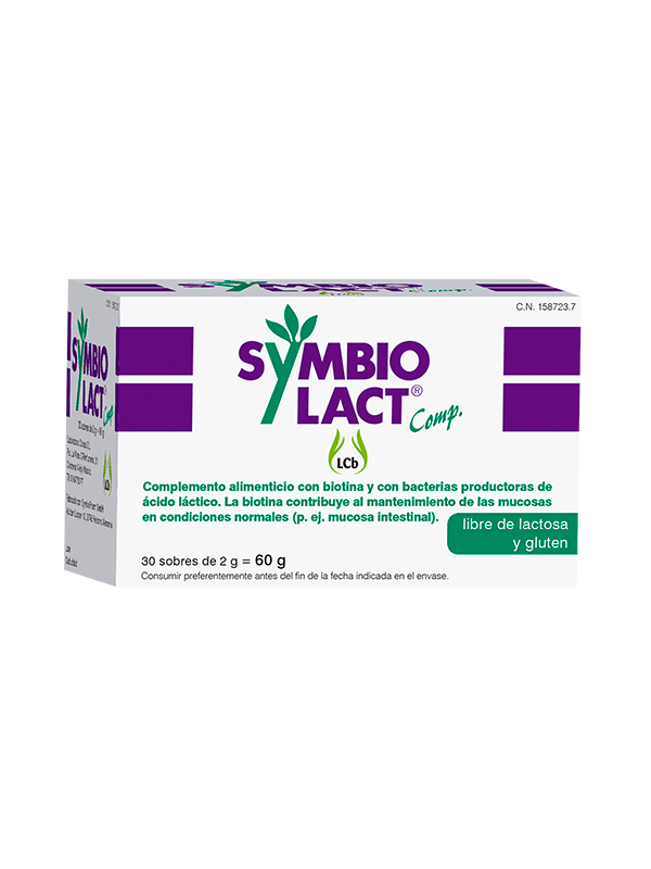 Complemento alimenticio con biotina para el mantenimiento de una mucosa intestinal normal y con bacterias productoras de ácido láctico.