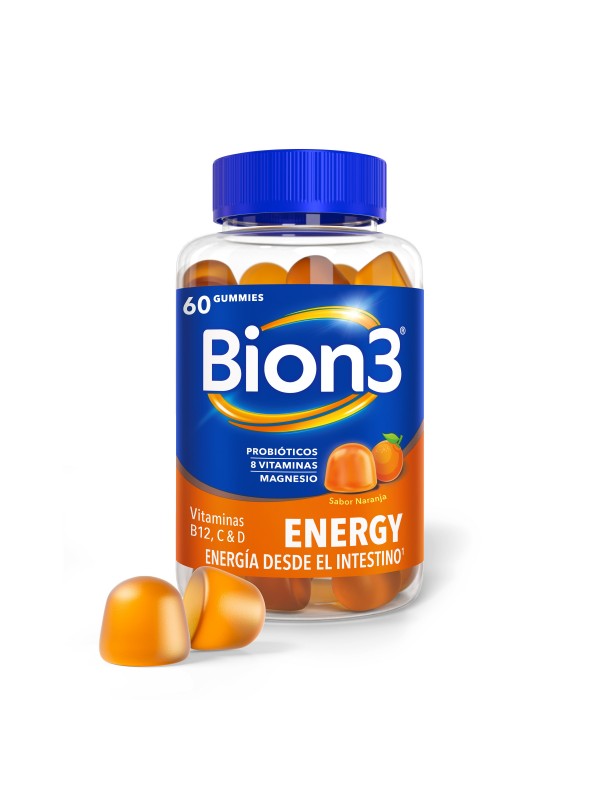 Bion3 Energy 60 GummiesDisfruta de una explosión de energía y bienestar con las Gummies Energy de Bion3. Esencial para quienes buscan mantener el ritmo en su vida cotidiana, este innovador complemento es tu aliado perfecto para encarar cada día con vitalidad.Diseñadas cuidadosamente para apoyar tu energía tanto mental como física, estas gummies contienen una fórmula única que te ayuda a sentirte recargado desde el interior.Formuladas con una combinación potente de probióticos, magnesio y un complejo de vitaminas B y C, cada gummy trabaja para nutrir tu cuerpo y apoyar un metabolismo energético óptimo.Reconocen la importancia del intestino en la absorción de nutrientes y, por ello, han diseñado un producto que además de energizarte, cuida de tu salud intestinal.Con 150 millones de probióticos específicamente seleccionados para llegar vivos al intestino y una selección de vitaminas esenciales, estas gummies contribuyen a mantener las mucosas en condiciones normales, y ayudan a reducir el cansancio y la fatiga.Además, su delicioso sabor a naranja y su formato en gummy hacen que incorporarlo en tu rutina diaria sea un placer.Apto para vegetarianos y libre de gluten, lactosa, gelatina animal, sabores, colorantes y edulcorantes artificiales.