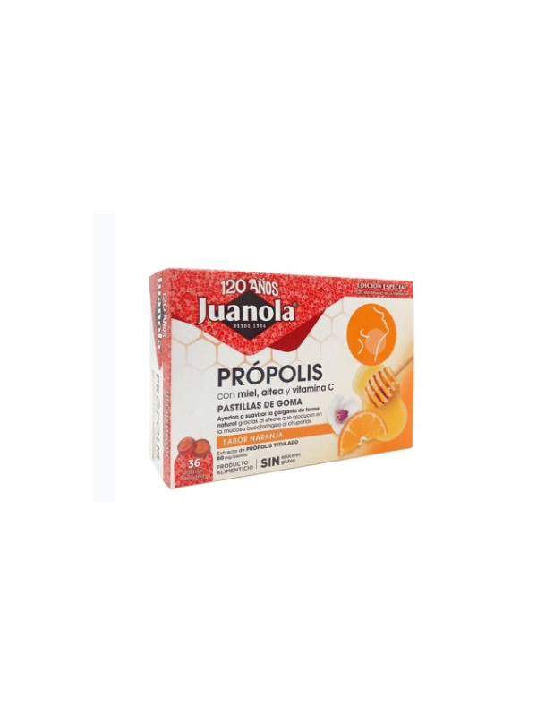 JUANOLA DE PROPOLIS CON MIEL,ALTEA Y VITAMINA C 36 PASTILLAS DE GOMA SABOR NARANJA.