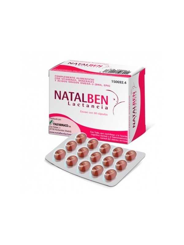 Durante la lactancia materna existe un aumento de las necesidades de vitaminas , minerales y ologoelementos para que la producción de la leche materna no atere el estado nutricional de la madre. Los principales componentes de Natalben Lactancia: Ácido Fólico (Vitamina B9): Durante la lactancia, los folatos de la madre pueden disminuir debido a su paso a la leche materna, que es la mejor fuente de ácido fólico para el lactante. El ácido fólico contribuye a la función psicológica normal. El ácido fólico también ayuda a disminuir el cansancio y la fatiga. Vitamina A: La concentración de vitamina A de la madre disminuye a medida que se prolonga la lactancia. La leche materna es la mejor fuente de vitamina A para el lactante. Vitamina D: Contribuye a la absorción y utilización normal del calcio. La concentración de vitamina D en leche materna depende de los niveles de vitamina D de la madre. Yodo: La mujer lactante necesita casi el doble de la cantidad de yodo que un adulto para garantizar que su hijo reciba todo el yodo que necesita a través de la leche. El yodo contribuye a la función cognitiva normal. Calcio: Las necesidades de calcio de la madre se incrementan considerablemente para mantener los depósitos de sus huesos y hacer frente a las demandas del lactante. El calcio contribuye al metabolismo energético normal y es necesario para el mantenimiento de los huesos en condiciones normales. Hierro: Contribuye a la formación normal de glóbulos rojos y de hemoglobina. Un aporte adecuado contribuye a que la madre pueda recuperarse del parto y para conseguir los niveles requeridos durante la lactancia. Ácidos Grasos Omega-3: Son nutrientes necesarios para el organismo y sólo pueden ser ingeridos con la dieta. El DHA contribuye al desarrollo normal del cerebro y ojos del lactante alimentado con leche materna. Se informa a las mujeres en periodo de lactancia de que este efecto beneficioso se obtiene con una ingesta diaria de 200 mg de DHA, además de la ingesta diaria recomendada de ácidos grasos omega-3 para los adultos, esto es 250 mg de DHA y de EPA. Composición Ingredientes: carbonato de calcio, aceite de pescado (DHA/EPA Omega 3), agente de recubrimiento (gelatina), agente de carga (aceite de linaza refinado), ácido L-ascórbico, humectante (glicerina E-422), fumarato ferroso, humectante (sorbitol E-420), taurina, acetato de DL-alfa tocoferilo, emulgente (lecitina de girasol E-322), nicotinamida, óxido de zinc, aceites vegetales, D-pantotenato cálcico, emulgente (cera amarilla de abejas E-901), palmitato de retinilo, cianocobalamina, sulfato cúprico, colorante (óxido de hierro rojo E-172), clorhidrato de piridoxina, riboflavina, mononitrato de tiamina, colorante (óxido de hierro negro E-172), yodato de potasio, ácido pteroilmonoglutámico, colecalciferol, D-Biotina, selenito de sodio.